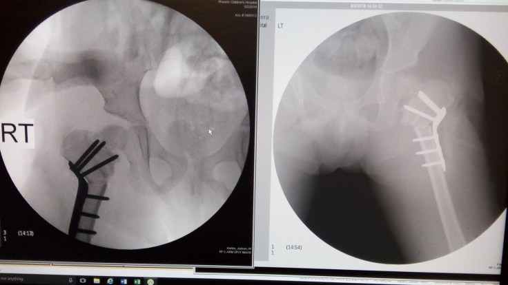 His surgeon stopped by a while ago to see how he was doing. He was also able to show us some x-rays of Elijah’s new hips… We’ll, they’re not new but you know what I mean.