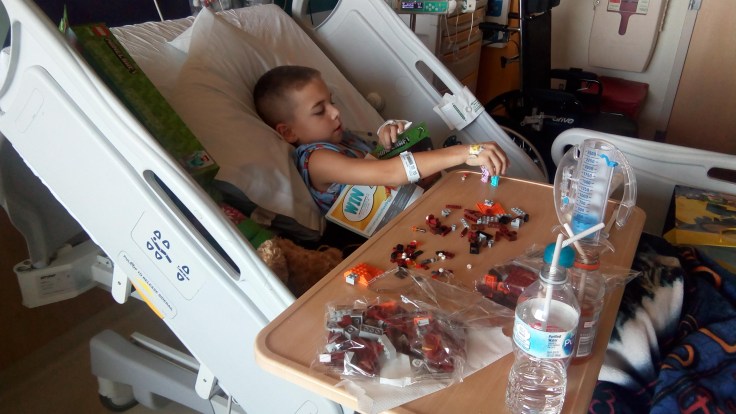 Then, he got his pain medicine and it didn’t take too long for him to start feeling better. We thought he would go to sleep rather quickly because of the type of medicine they gave him but it actually just seem to wake him up more. His Aunt Jennifer and cousin Leah came to visit him and he chatted with them and played with one of his new building sets. He’s still over there playing with it and talking with me as I type this out.