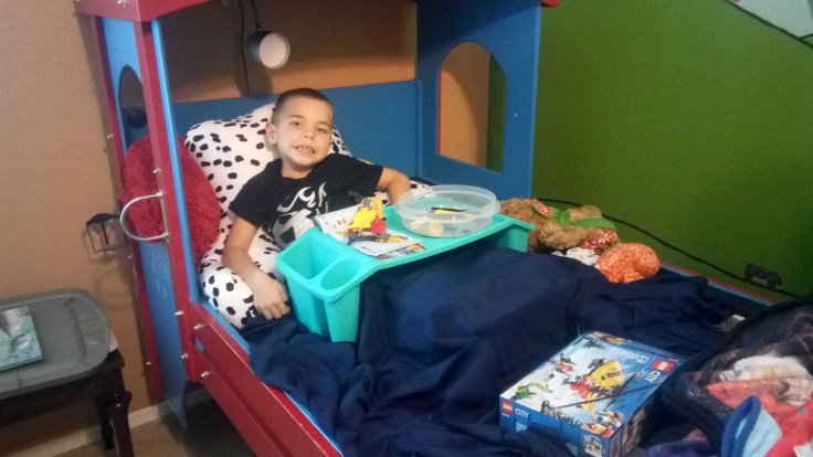 After that we got a surprise visit from his Aunt Jennifer who brought him a special tray that he can use to work on projects or hold food or whatever we need it to. It worked great at rest time when he wanted to build his new Lego set in bed.