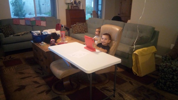 On a similar note I had ordered a table for him, not necessarily as a present but just something that we could use. We move him between different seats throughout the day and it’s not always easy to do things like eating or working on projects depending on where he’s at. For example his wheelchair doesn’t fit under the kitchen table, so we would set something flat on his lap and then set the food in his lap. Or if we wanted to seat him out by the TV, we put him in a chair that Grandma and Grandpa Rice let us borrow, but it’s too wide for most TV trays to fit and we didn’t have anything to use there either. after doing a little research and looking around I decided to buy a smaller 4×2 foot folding table that is height adjustable. I had done some measuring and figured out that it had perfect heights for both his wheelchair and the chair in the living room. So now whichever chair he’s in, we can set up the table in front of him and he can use that to eat or work on whatever. We’ve only had it since this afternoon but it’s working great so far.