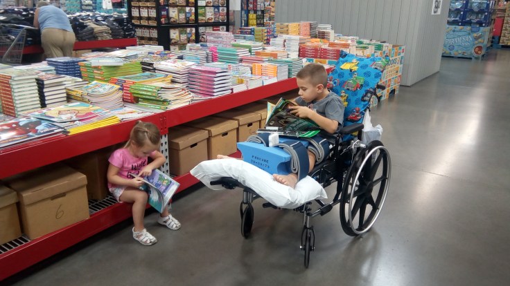 He slept well again last night and slept in quite a bit this morning. Around lunch time we took a trip to Walmart and Sam’s Club. That went pretty well, and it was nice to get out of the house. One of the things we picked up at Walmart was a handheld shower head that we can use to better wash him. That was one of the issues with the shower last night. Putting him under a normal shower head didn’t really work too well. Anyways, back to our shopping trip. We wanted to let him push himself around for a bit, but that didn’t work too well. This wheelchair is a bit wider and the brakes on it are in a spot where they hit his hands when he tries to turn the wheels himself. He can do it, but it’s just not too easy or comfortable with his hands hitting the brakes. But we wheeled around for a bit and did some shopping and looking, and grabbed some lunch.
