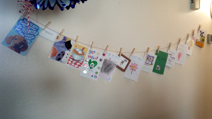 At some point in the day Julia and I also worked on gathering together all of the cards we’ve received so far and hung them on the wall as a reminder to all of us of all the support and love we’ve received from everyone. Here’s a look at what we have so far.