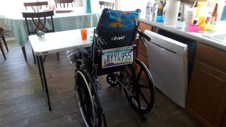 Haha, yeah right! This was actually his idea though. He mentioned an old license plate we had and asked me if I could attach it to the back of his wheelchair, so I did. We’ll leave it on there and hopefully it’ll give some people a chuckle.
