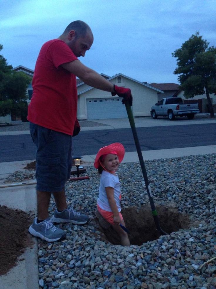During the kid’s rest time, the plumber came to check out our leak. After talking about the problem, he did a quick check to verify if the things I told him were accurate. The first thing he checked was the shut-off valve going into the house. I had told him I checked it and it indeed shut the water off because I had tested it in different faucets in the house to make sure. However, when he shut it off he tested it with the spigot directly above the shut-off valve. Water did not stop coming out of that spigot even though the water was supposed to be shut off. It wasn’t a lot of water, but enough to know that some water was making it through the shut-off valve. The reason my checks didn’t catch this were because the faucets were higher and gave me the perception that no water was making it through when it was just not making it through enough to keep them running, if that makes sense. Anyway, this was a bit scary because it meant that the leak could still be somewhere under the house. It didn’t have to be in the front yard. The first thing he would have to do is to install a new shut off valve, which would then be able to give him an accurate idea of whether or not the leak was in the yard or under the house. I had him replace the valve at which point he confirmed the leak was indeed in the front yard somewhere. While this still isn’t great news, it’s definitely better than having a leak under our slab somewhere. He informed me that he didn’t have the necessary tools to pinpoint where the leak is coming from exactly, but could refer me to someone who could possibly, and I emphasize possibly, find the location of the leak. Turns out, this is a bit trickier then you may expect. The main issue is that the line can be made of two different materials, either copper or PVC pipe. The person he referred us to could pinpoint the leak exactly if the line was copper, but he wouldn’t be able to give us a location if the line was PVC pipe. And in order to find out whether your line is copper or PVC pipe you basically have to dig it up. But you can’t just dig it up by the meter or by the shut-off valve because those areas have to be copper or metal, but they can be changed after a distance of 5 feet. Compounding on top of that there’s no way to know exactly what route the pipes are taking through the yard so you either have to just dig a 5-foot line from one of the entry points or make an educated guess as to where it’s going, dig there, and hope you’re right. I didn’t want to pay the money for this man to come out only to find out we had PVC pipe and he couldn’t help us, but I also didn’t want to miss the chance that the fix would be easier if we could pinpoint the exact location of the leak. Oh, let me jump back a little bit. There are two main options for fixing this problem. We can either replace the entire line, which they recommend if it’s PVC pipe, or we can perform a patch if it’s copper. So, we were hoping for copper. I decided that I would do some digging before we made any decisions, so that I could try and find out what type of pipe we had. I went for the option of guessing where the line was going and hoping I’d hit it. I did, and it turns out it’s PVC pipe. Not what we were hoping for. Looks like we’re probably just going to have to suck it up and replace the entire line. Definitely not good news, but not as bad as it could have been if the leak was under our slab somewhere.