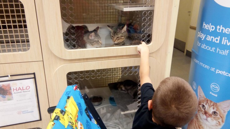 Grandma Rice brought Abigail back around lunch time and we had a pretty mellow afternoon. After rest time, we took a trip to the pet store. Elijah has a fish tank in his room, but most of his original fish have passed on. We were down to one fish, and we thought it would be fun to go out and get some new fish for the tank. It’s also just fun going to the pet store to look at the animals. The kids especially liked the cute cats that they would try to touch through the windows.