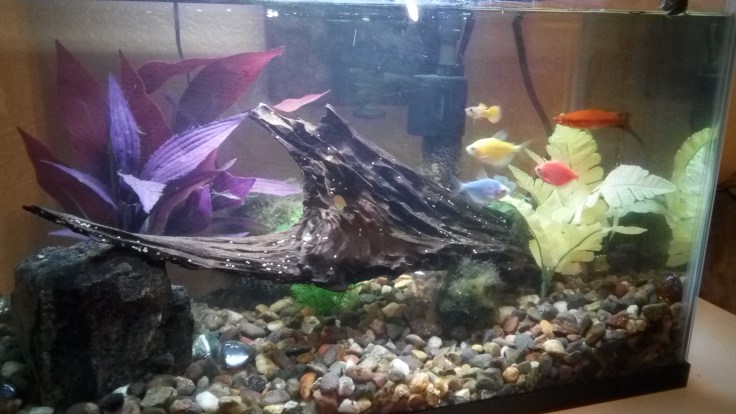 We we picked out a few fish, brought them home, and put them in the tank. Oh, and we got some ghost shrimp too. They are just a small clear shrimp that feed off of pretty much anything and are quite fun to watch, when you can see them.