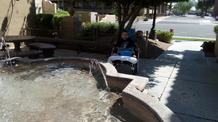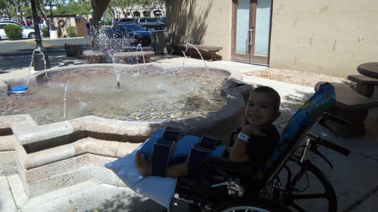 Here are a couple pictures of Elijah checking out a fountain by the doctor’s office.