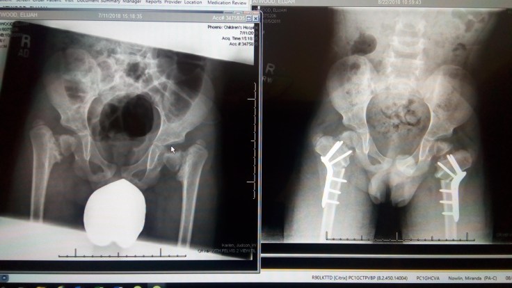 While they were working on the yard, we took Elijah to his doctor appointment. Julia’s sister Jennifer took Abigail for us so we didn’t have to take her to the appointment. We got in to see the doctor pretty quickly and the appointment didn’t last too long. They took a couple of x-rays, and here’s a before and after so you can see what his hips looked like before the surgery and what they look like as of this morning.