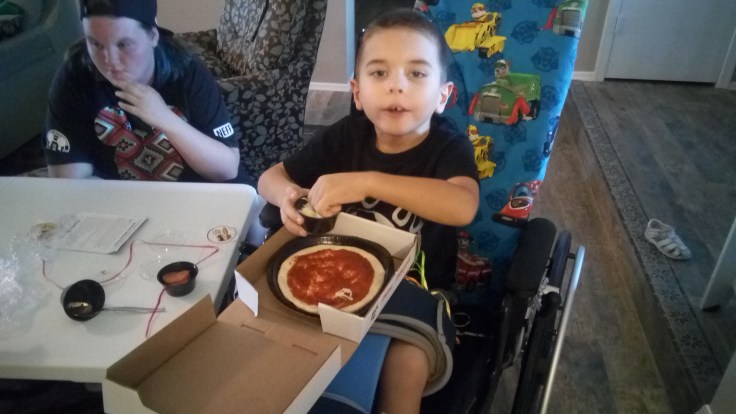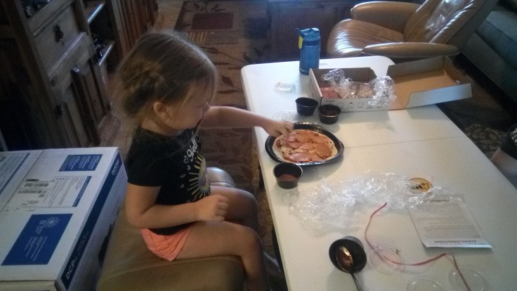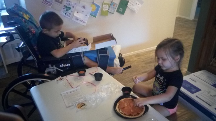 I had stopped on my way home to pick up some pizza for dinner. But not just any pizza. If you haven’t heard of Papa Murphy’s, it’s a take and bake pizza chain. They sell little kits for kids to make their own personal pizzas. These are a special treat we get for the kids every once in a while. I picked up kits for Elijah and Abigail and got another pizza for Julia and I. The kids had fun putting together their own pizzas, and enjoyed eating them as well!