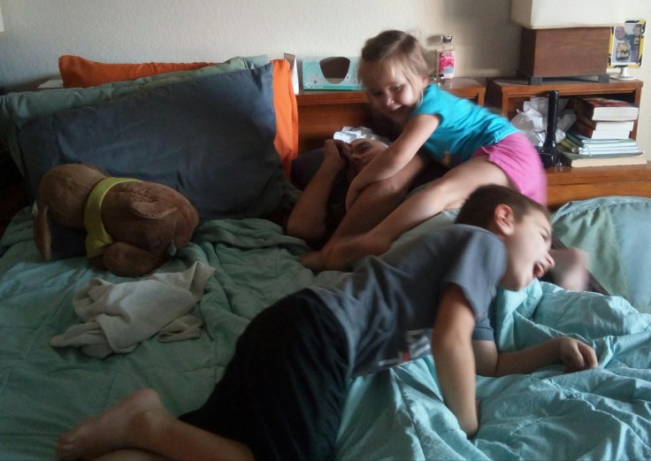 Here is another thing that’s returning to normal. When I get home from work, I usually take a nap because I don’t sleep a lot at night. Then it’s somewhat of a tradition for the kids to come wake me up. Today they came and woke me up with some gymnastics on top of me!