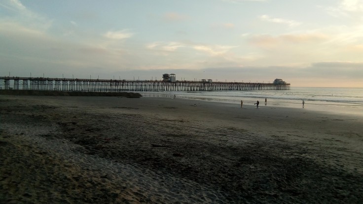 Then we headed to the beach in the afternoon. This day was sunny, but a big cooler so it was comfortable standing around in the sunshine, especially with our feet in the cool ocean water. We decided to have dinner at a restaurant at the end of the pier that night.