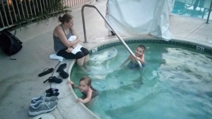That first night, they did each fall in the water once and got tumbled around a bit by the current. It was good enough to scare them so they wouldn’t go too far, but wasn’t scary enough to keep them out of the water. The water was a bit chilly, but a quick dip in the hot tub at the hotel warmed them right up.