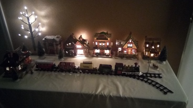 Something that we’ve been doing over the last few years, with the help of Julia’s sister Jennifer, is collecting and building up our Christmas village scene. She started Elijah on this, and each year has been adding to his collection. Julia and I have also added a couple pieces as well, and this year we started Abigail on it as well. Here’s a picture of the scene in Elijah’s room.